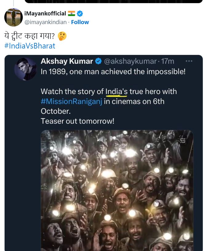 एक्स (जिसे पहले ट्विटर कहा जाता था) यूजर्स ने अक्षय कुमार (अब हटा दिए गए) द्वारा पोस्ट किए गए पिछले पोस्टर के स्क्रीनशॉट पोस्ट किए थे, जिसमें भारत के बजाय इंडिया शब्द था। इंटरनेट के एक वर्ग ने फिल्म से संबंधित अक्षय कुमार के पिछले ट्वीट के अस्तित्व पर सवाल उठाया, जिसमें भारत के बजाय इंडिया शब्द का इस्तेमाल किया गया था। “ये ट्वीट कहां गया?” एक यूजर ने पूछते हुए ट्वीट किया। एक नजर नीचे डालें-