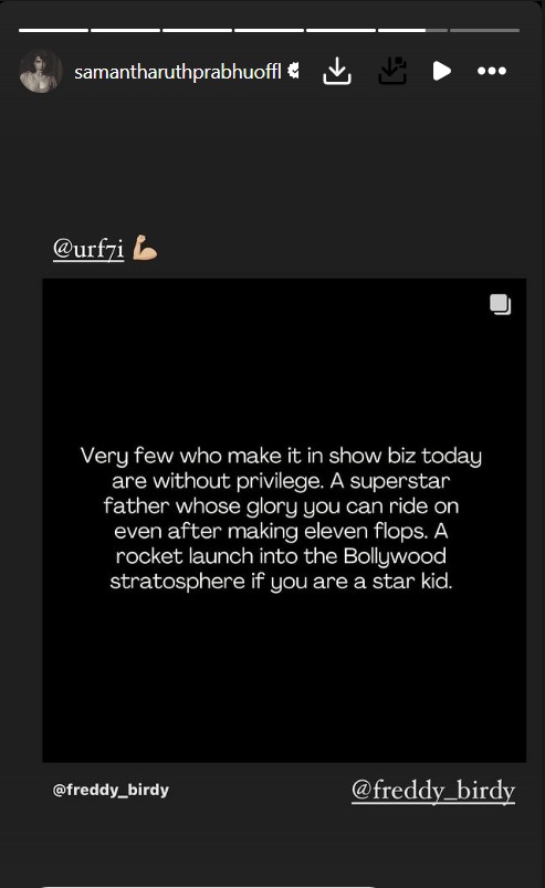 मंगलवार, 8 अक्टूबर को, सामंथा ने अपने इंस्टाग्राम हैंडल पर @freddy_birdy हैंडल द्वारा अपलोड की गई एक पोस्ट को फिर से साझा किया, जिसमें उद्योग के कुछ कलाकारों पर प्रकाश डाला गया है जो बिना किसी मदद या गॉडफादर के शीर्ष पर पहुंचते हैं। पोस्ट में लिखा है, “आज शो बिजनेस में जगह बनाने वाले बहुत कम लोग विशेषाधिकार के बिना हैं। एक सुपरस्टार पिता जिनकी महिमा पर आप ग्यारह फ्लॉप फ़िल्में बनाने के बाद भी सवार हो सकते हैं। यदि आप एक स्टार किड हैं तो बॉलीवुड स्ट्रैटोस्फियर में एक रॉकेट लॉन्च। सामंथा ने उर्फी को टैग किया और मसल इमोजी के साथ अपना प्यार जताया।